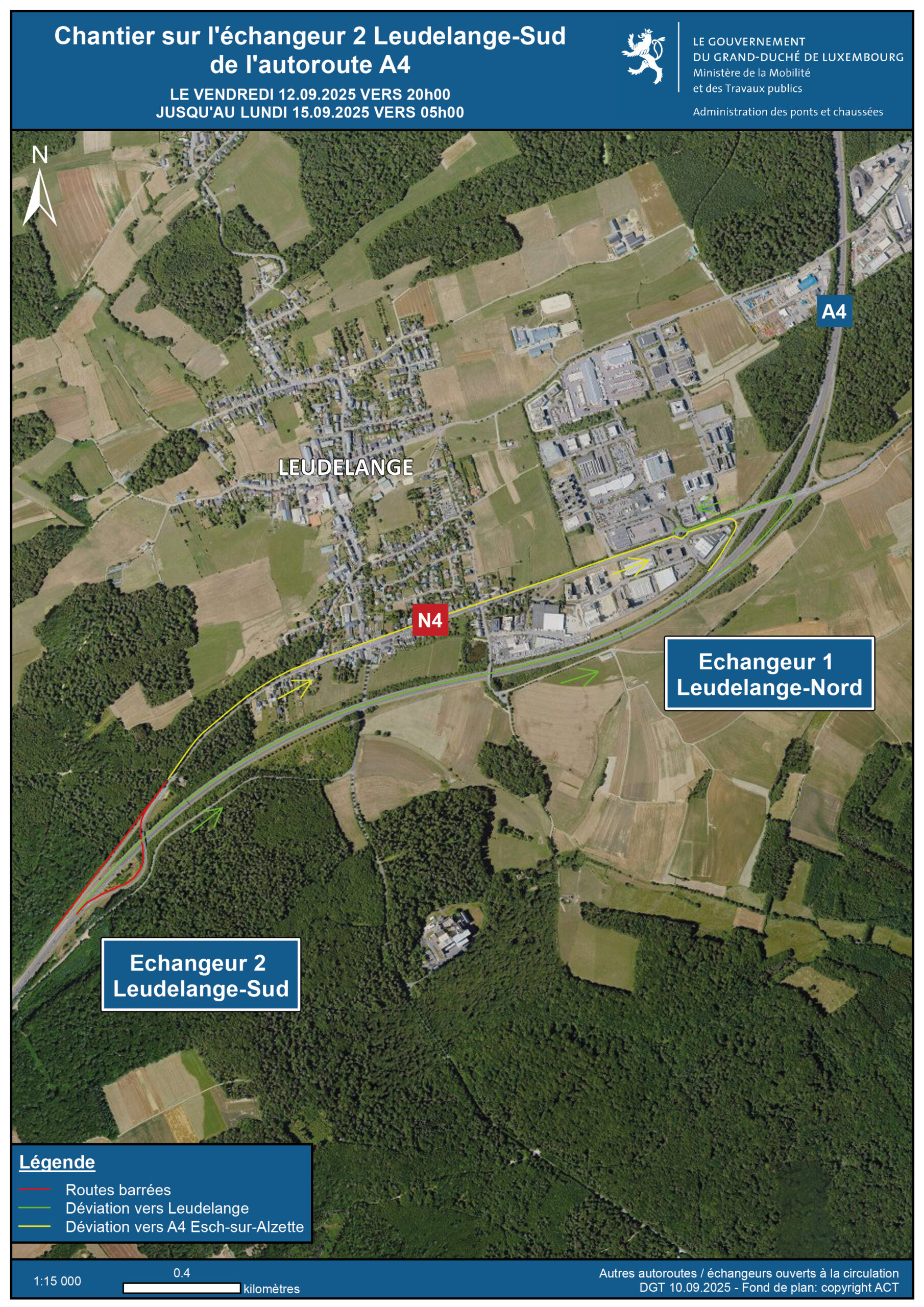 Chantier sur l’échangeur Leudelange-Sud de l’autoroute A4 du vendredi 12.09.2025 vers 20h00 jusqu’au lundi 15.09.2025 vers 05h00