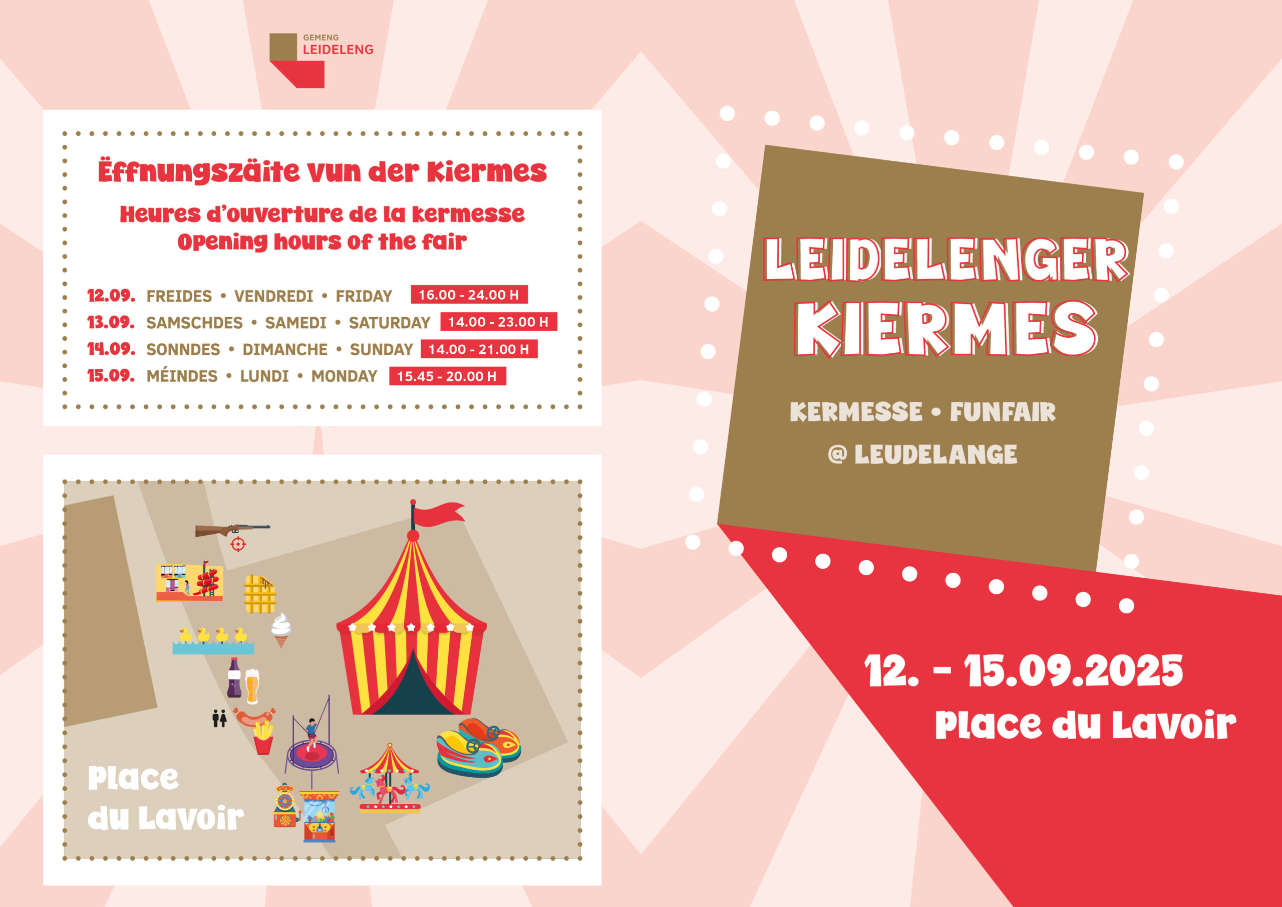 E Méindeg, de 15. September ass net nëmme Schoulrentrée, mee och leschten Dag vun der Leidelenger Kiermes. D’Kanner kënnen direkt vun der Schoulbänk eriwwer op d’Kiermes goen, well déi mécht hier Dieren extra um 15:45 Auer op. Bis owes 20 Auer kënnt dir nach vun de Spiller, den Iess- a Gedrénksbuden an der flotter Kiermesstëmmung profitéieren.
