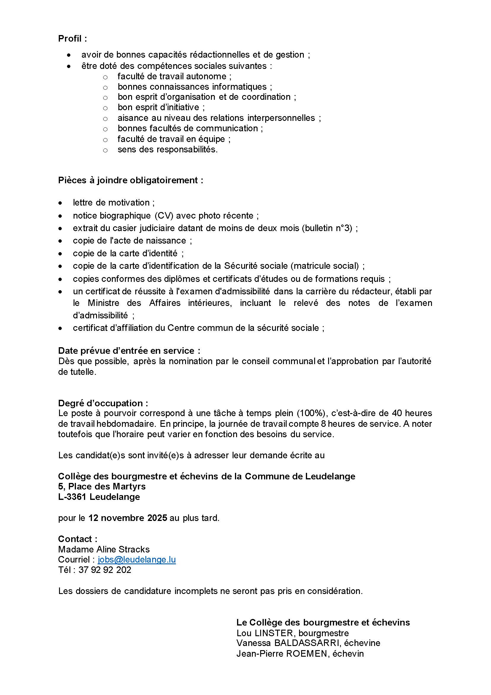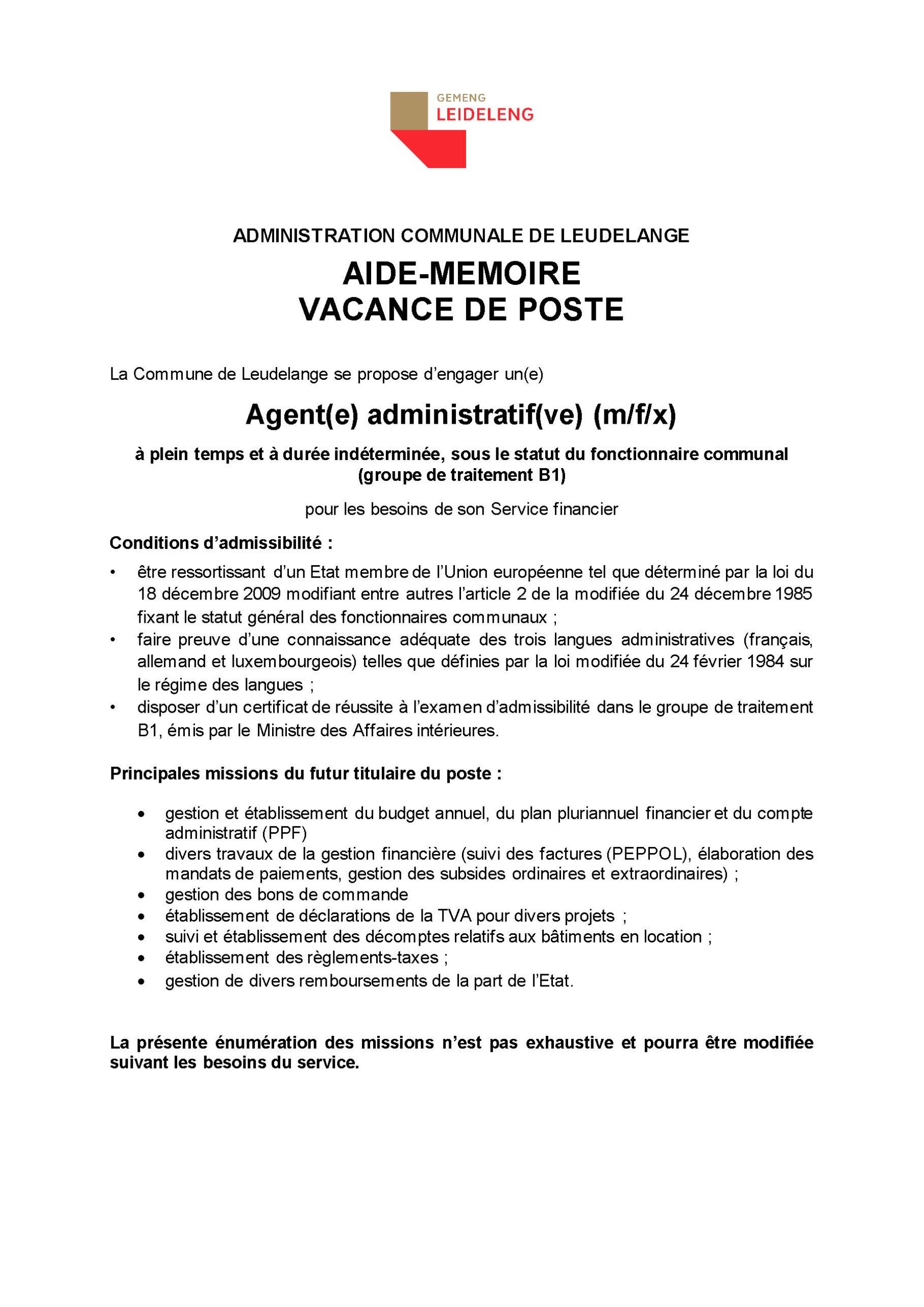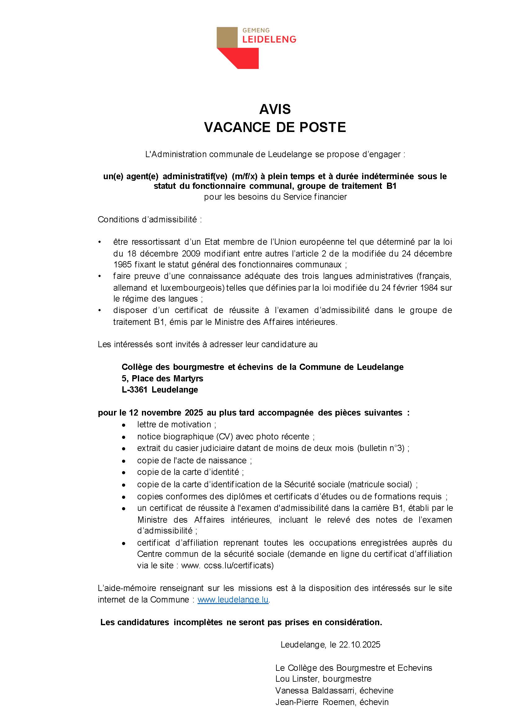 La Commune de Leudelange recrute un Agent administratif (B1)